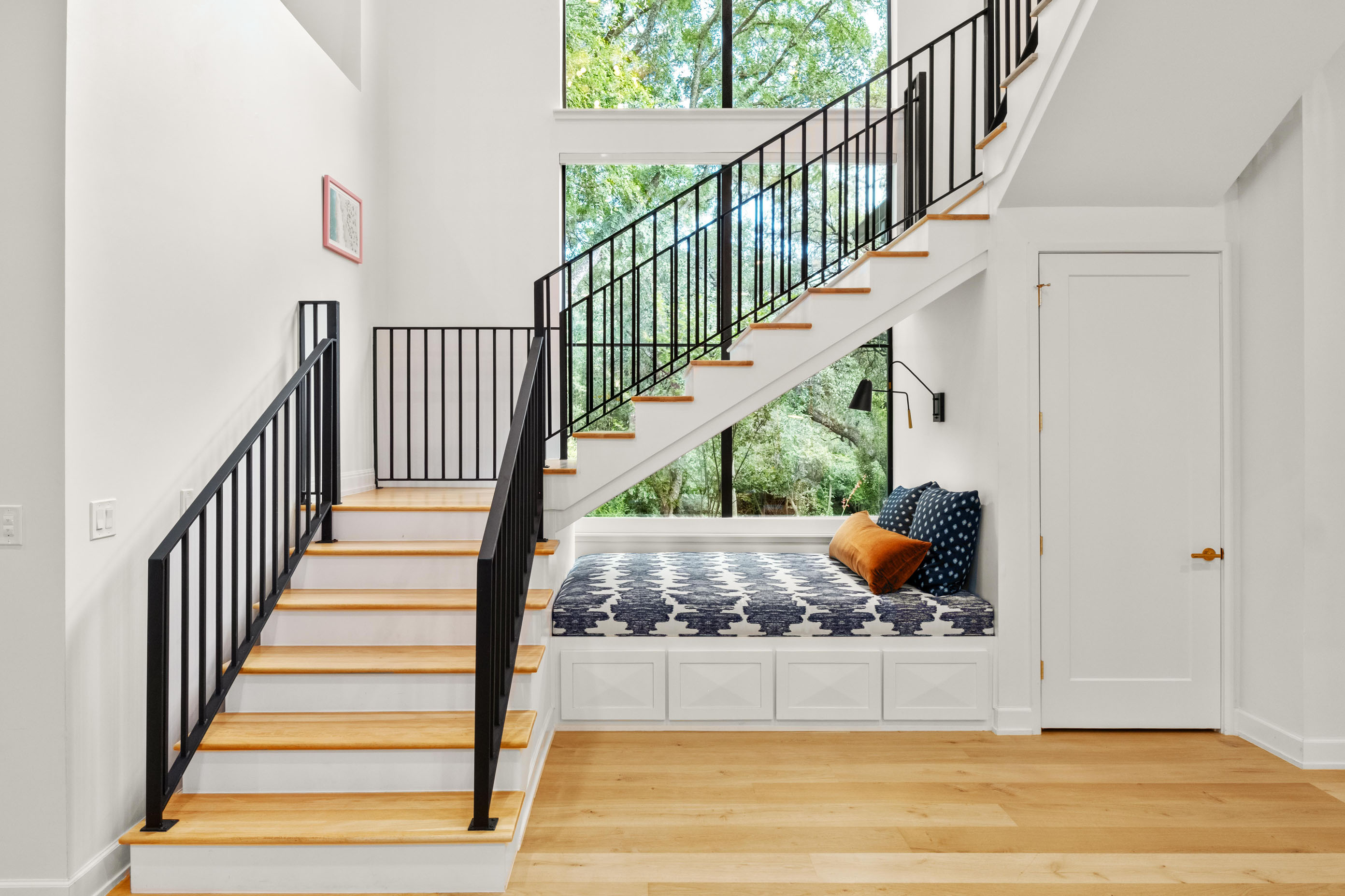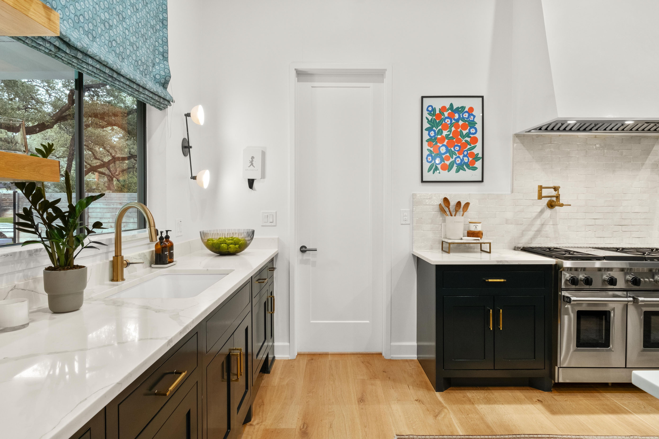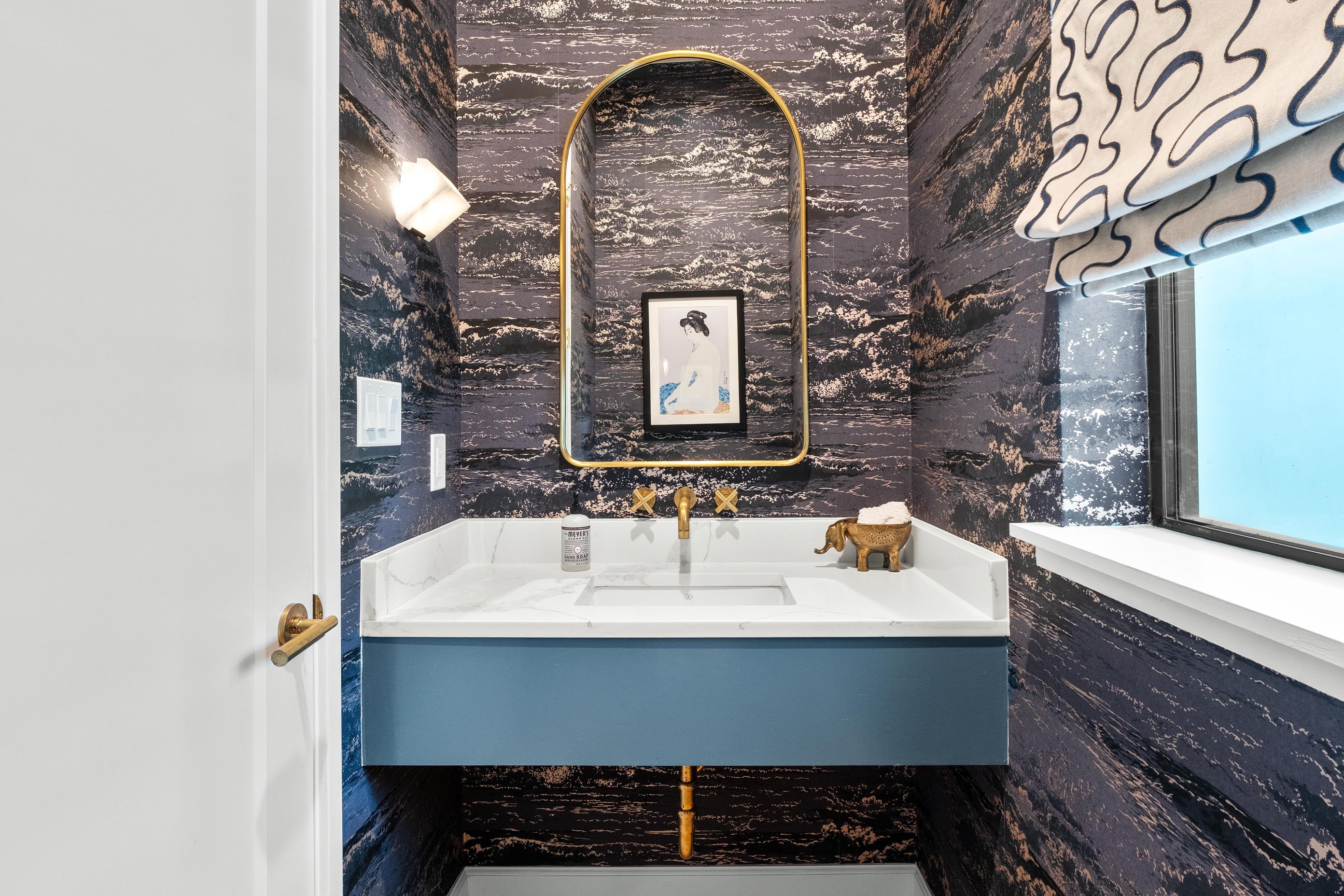 The home’s sophisticated yet welcoming palette combines color, texture, and pattern. Custom draperies and window treatments throughout. Statement wallpaper brings personality to the powder room, primary bath, laundry room, and the upstairs bedroom. Striking lighting choices—including a dramatic pendant by acclaimed Australian industrial designer Christopher Boots—add artistic flair throughout the space.