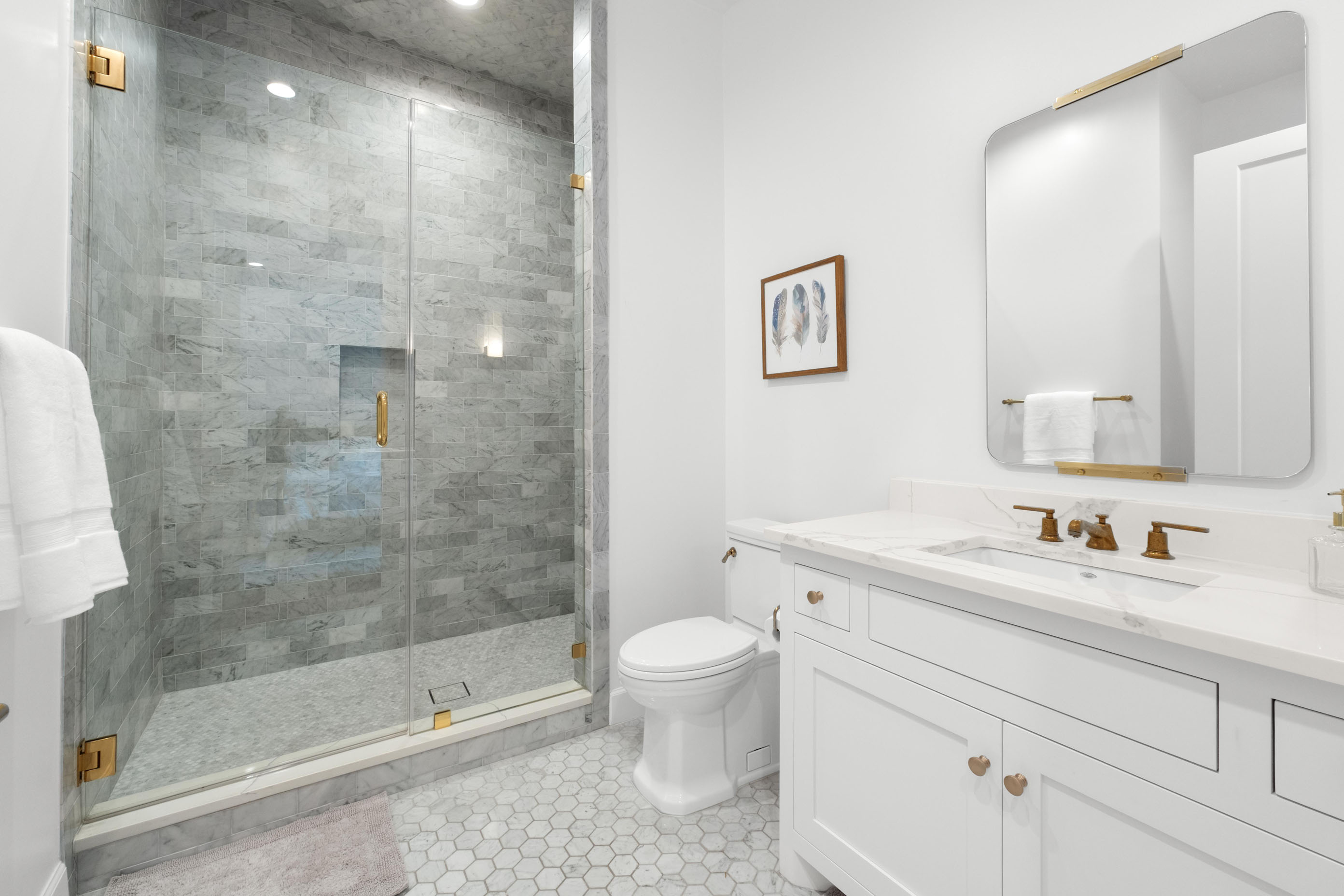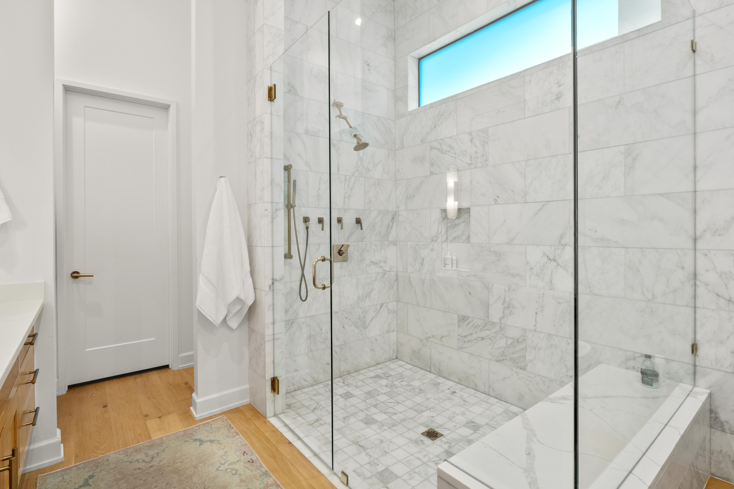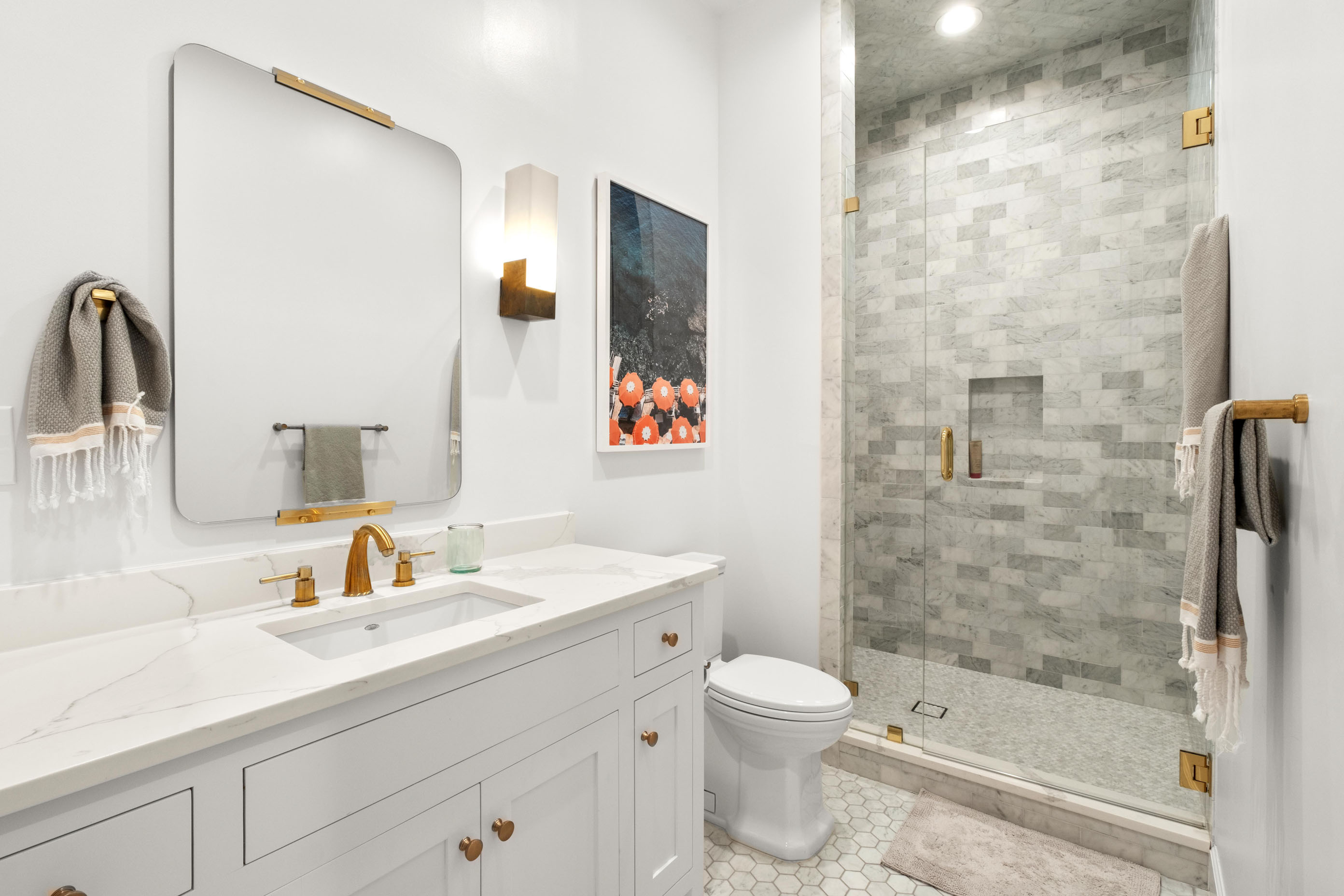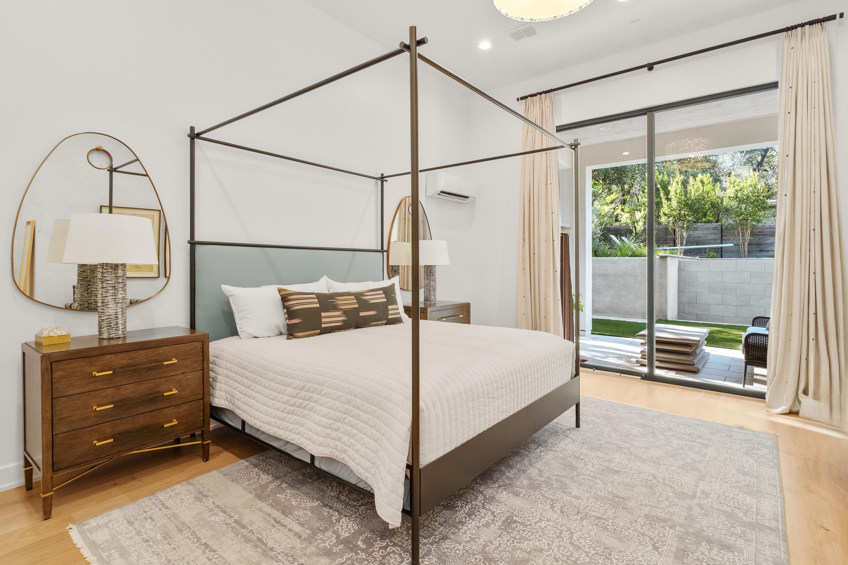 The home’s sophisticated yet welcoming palette combines color, texture, and pattern. Custom draperies and window treatments throughout. Statement wallpaper brings personality to the powder room, primary bath, laundry room, and the upstairs bedroom. Striking lighting choices—including a dramatic pendant by acclaimed Australian industrial designer Christopher Boots—add artistic flair throughout the space.