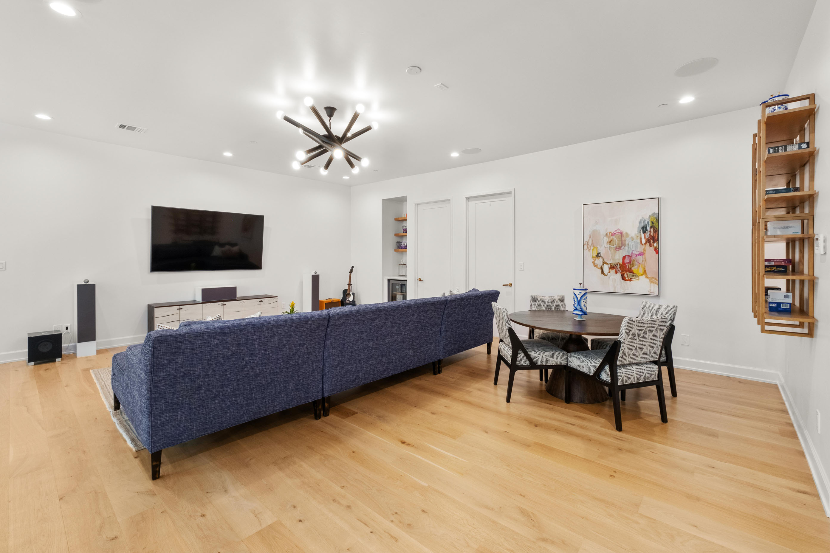The primary suite is conveniently located on the main level, while the upper floor features three additional bedrooms—each with its own ensuite bathroom—as well as a secondary living area perfect for kids or media. One of the upstairs bedrooms includes a custom-built Murphy bed, making it easy to convert the space from a home gym to a guest suite/bedroom.