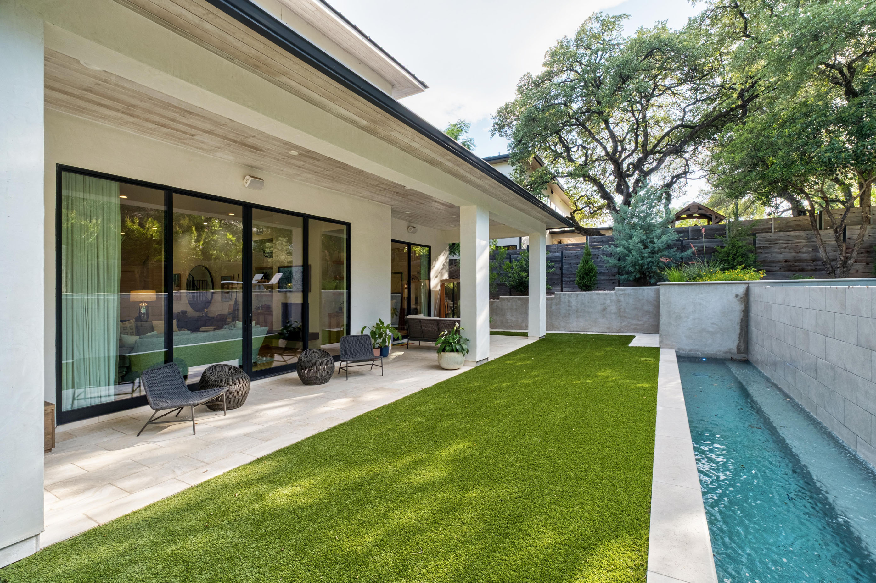 Backyard - Heated Pool by Modern Pools (9 ft deep w/ diving board & water feature), Putting Green, Outdoor Kitchen, Custom Metal Planters